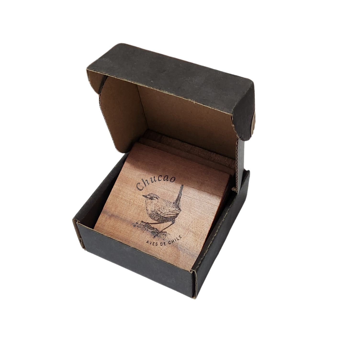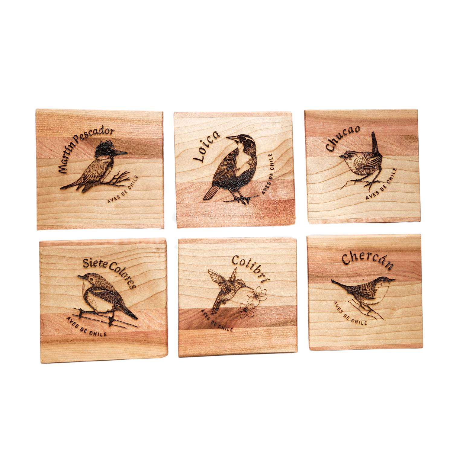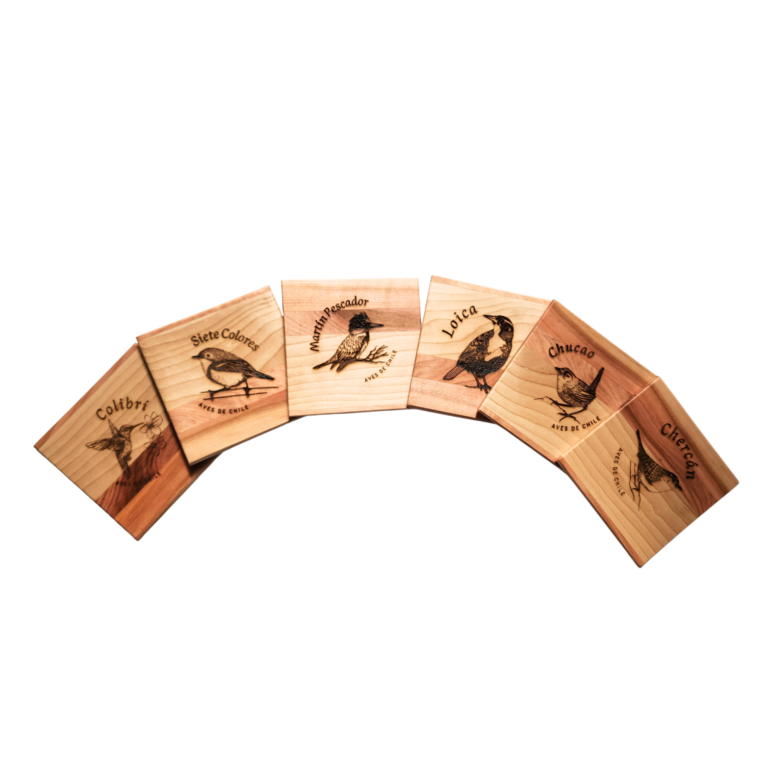 Descubre la calidez y el encanto del sur de Chile con este exclusivo set de 6 posavasos fabricados con retazos de madera nativa recuperada, como roble, lenga y raulí. Cada pieza es única, con vetas y tonos naturales que cuentan su propia historia. Además, tienen un hermoso grabado de 6 aves chilenas diferentes: Loica, Picaflor, Siete colores, Chucao, Chercán y Martín Pescador.